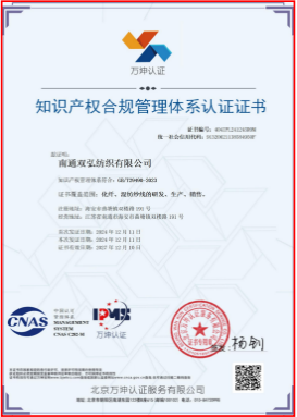 Certificering af Intellektuel ejendomsret til styring af styring af styring af styring er en overensstemmelsesvurderingsaktivitet, hvor et tredjepartscertificeringsorgan evaluerer det interne intellektuelle ejendomsadministrationssystem for en virksomhed for at bekræfte, at det overholder kravene i relevante nationale standarder eller tekniske specifikationer. På nuværende tidspunkt har Double Great Company 5 indenlandske registrerede varemærker og 2 Madrid International registrerede varemærker. Det dobbelte store varemærke er et velkendt varemærke i Kina; Det har mere end 50 nationale opfindelsespatenter og nytte -modelpatenter og vandt China Textile Industry Patent Gold Award; Det har gennemført 4 nationale fakkel og 5 gnistplanprojekter; Det har formuleret 3 nationale standarder, 11 industristandarder, 4 gruppestandarder og 3 toldbehandling af handelsenhedens forbrugsstandarder; Det har udført branche-universitet-forskning, og 5 nøgleteknologi og videnskabelige og teknologiske præstationsprojekter har vundet den anden pris af China Textile Industry Science and Technology Progress.