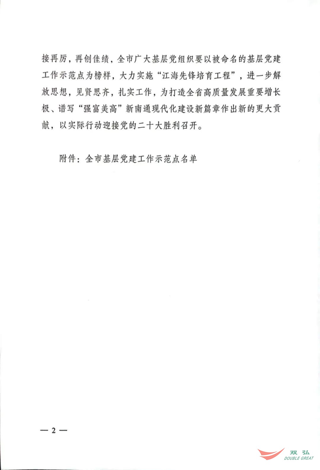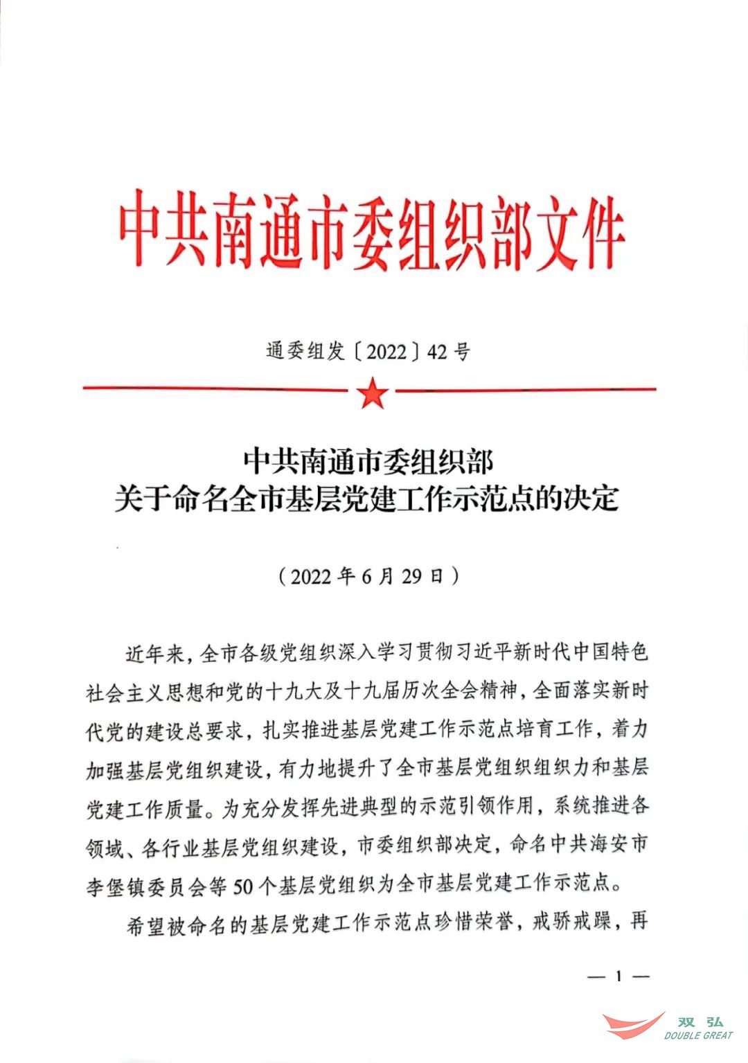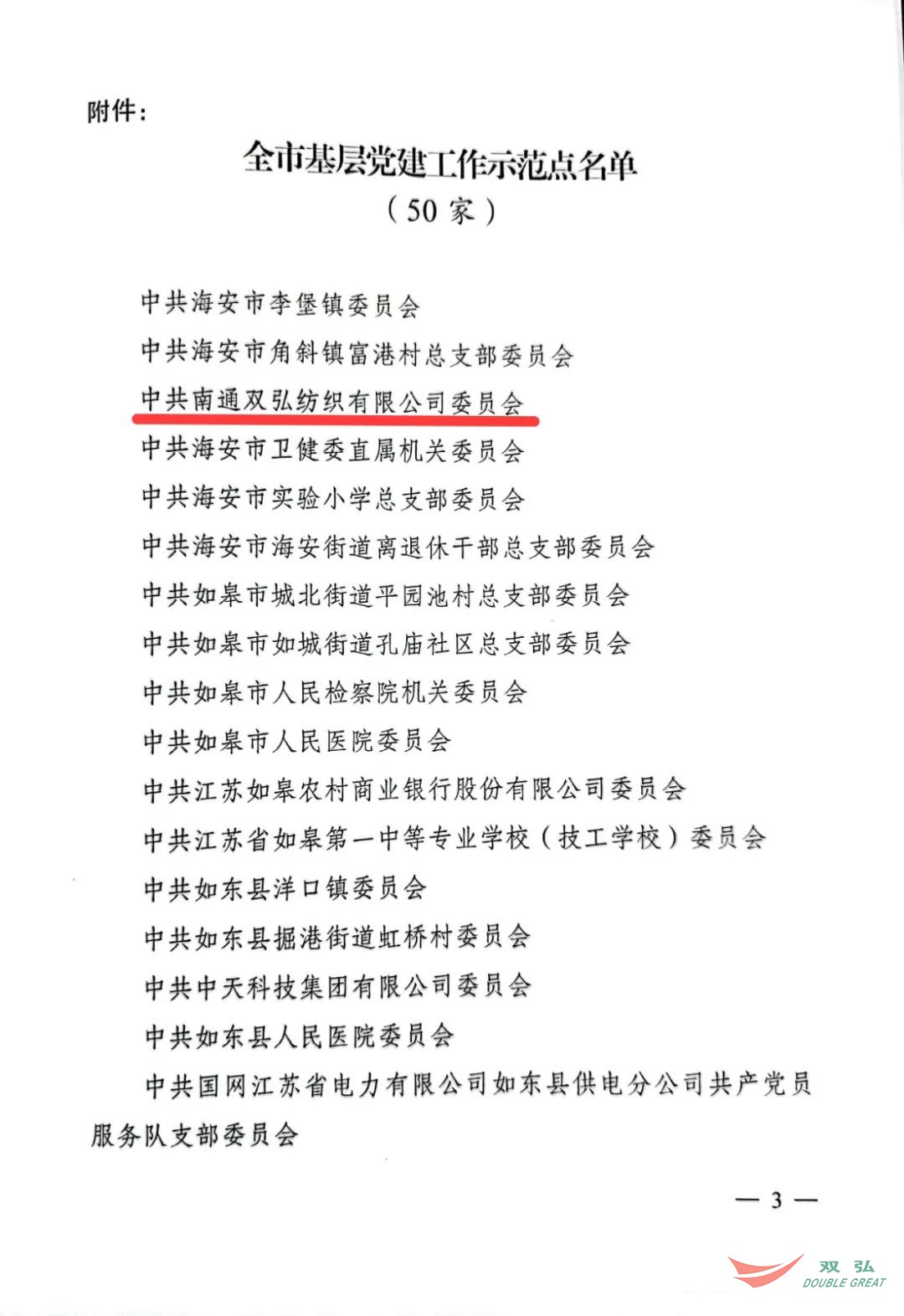 For nylig udstedte Organisationsafdelingen for CPC Nantong Municipal Committee et dokument, der navngav 50 Grassroots Party -organisationer som byens demonstrationssteder for græsrodsfestbygning. Partiudvalget i Nantong Double Great Textile Co., Ltd. blev tildelt titlen "Byens Demonstrationssted for Grassroots Party Building -demonstration".