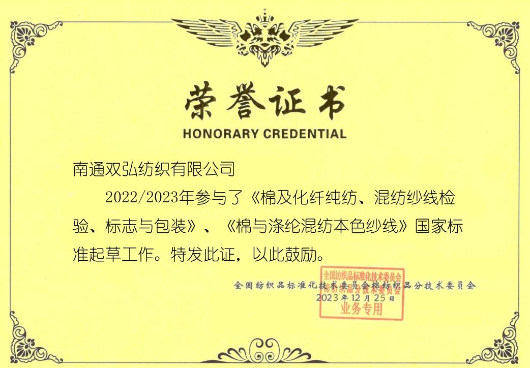 Som vicegeneralsekretærenhed i det nationale tekniske udvalg for standardisering af bomuldstekstiler og En medlemsenhed i det tekniske udvalg for standardisering af Kina National Textile and Apparel Council, Double Great Company Deltager aktivt i standardiseringsaktiviteter, deltager i formulering og revision af forskellige standarder, tager initiativet At gennemføre udarbejdelsen og gennemgangen af standarder og fremsætter mange værdifulde meninger. Nogle innovative forslag er blevet vedtaget og størknet og bliver masterversionen af standardudkast. Double Great Company har successivt formuleret 3 nationale standarder, 11 industristandarder, 4 gruppestandarder og 3 Toldbehandling af forbrugsenhedsstandarder og vandt titlen National Advanced Unit for tekstilindustristandarder og National Enterprise med fremragende bidrag til tekstilstandardisering.