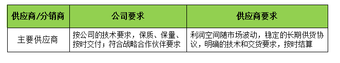 Virksomheden lægger særlig vægt på forholdet til leverandører og har identificeret nøgleleverandører og partnere. For at fremme langsigtet samarbejde, gensidig forbedring og win-win-udvikling mellem de to parter udfører det hovedsageligt følgende aspekter.