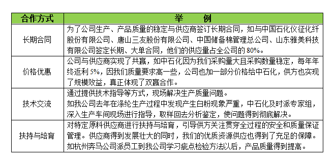 De vigtigste leverandører er: Sinopec Yizheng Chemical Fiber Co., Ltd., Tangshan Sanyou Co., Ltd., Xinjiang Production and Construction Corps nr. 3 Agricultural Division Supply and Marketing Cotton og Linen Corporation, Shandong Yamei Technology Co., Ltd., osv., Og deres forsyningskonti for 80% af selskabets samlede beløb.
