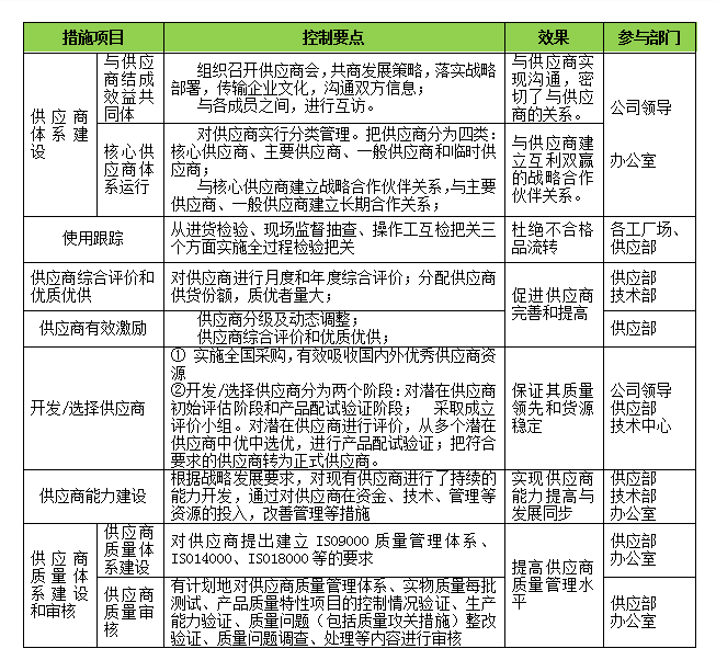Brug evaluering og incitamentsforanstaltninger for leverandører til at fremme selvforbedring og kontinuerlig forbedring af leverandører; Introducer leverandørressourcer af høj kvalitet gennem leverandørudvikling og byggeri, forbedrer produktionsskalaen og styringsniveauet for eksisterende leverandører, reducerer indkøbsomkostninger og forbedrer forsyningskædens konkurrenceevne. .